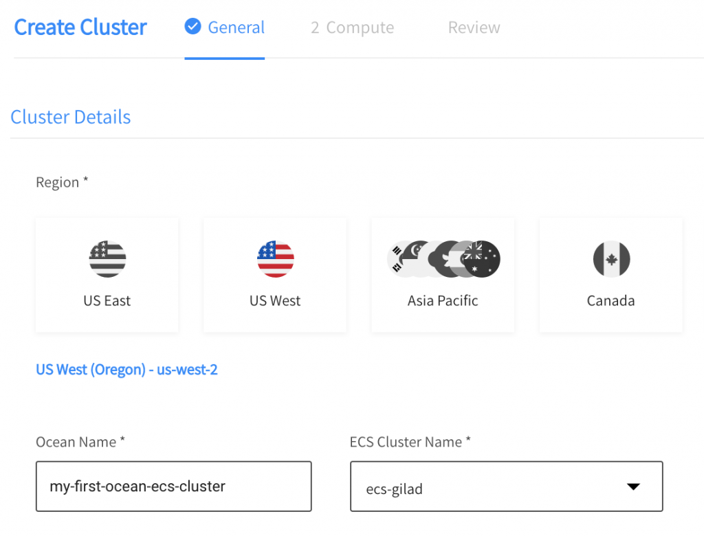 - In the General page, choose the Region where the cluster is running, enter an Ocean Name, and choose the ECS Cluster to connect.